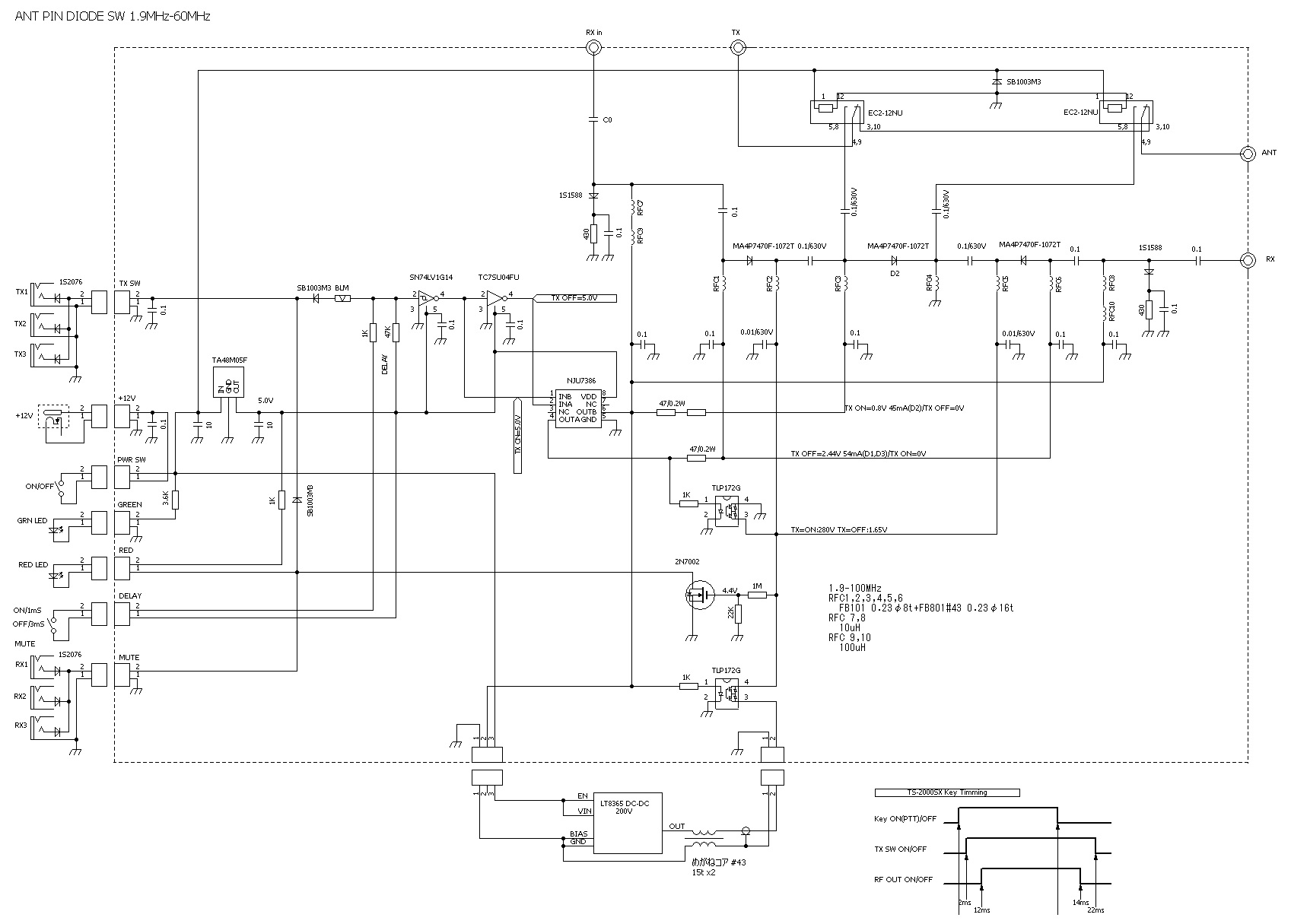 上記回路図でシュミットインバーター(SN74LV14)のプルアップを47KΩに変更して3.4msの遅延としています。(IC-705は3ms必要)