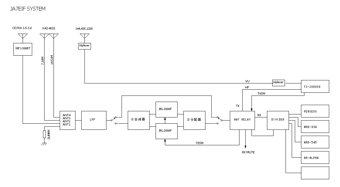 私のシャックは受信分配をしていますので、トランシーバーの後にアンテナ切替器が必須となります